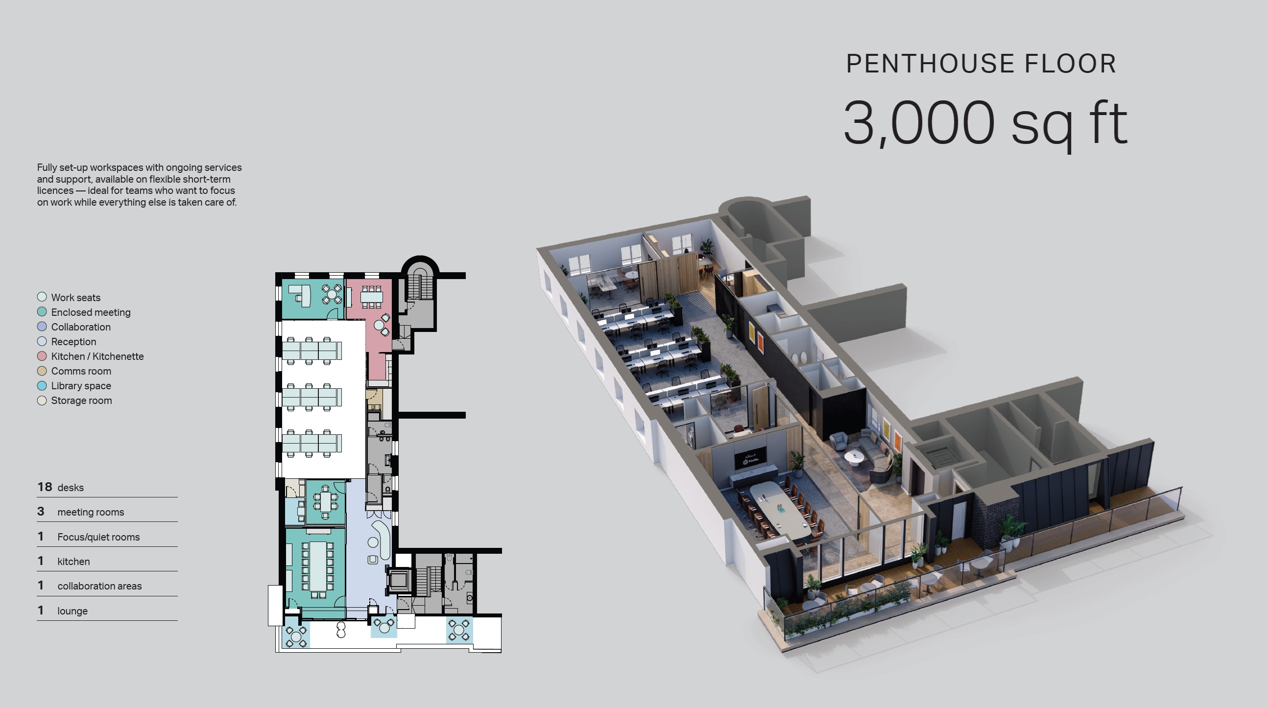 The Penthouse on Hume Street is a fully furnished, self-contained office located beside St. Stephen’s Green in Dublin. Positioned on the fourth floor, the space is designed for flexible working, offering a blend of open-plan areas, collaborative zones, and private spaces for focused work. It also features a dedicated kitchen, comms rooms, toilets, employee lockers, and an impressive rooftop terrace.